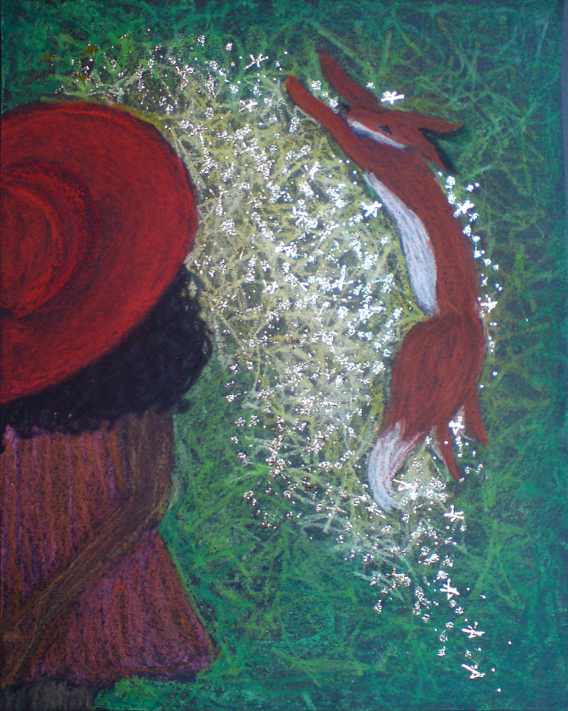 All through my Journey Odelya was there as a presence, but I only saw her as pictured, wearing her big red hat, and I was only ever aware of her when I was watching over her shoulder watching fox and I dance and play. I was nothing but the essence of my self, a cloud of golden sparkling light.